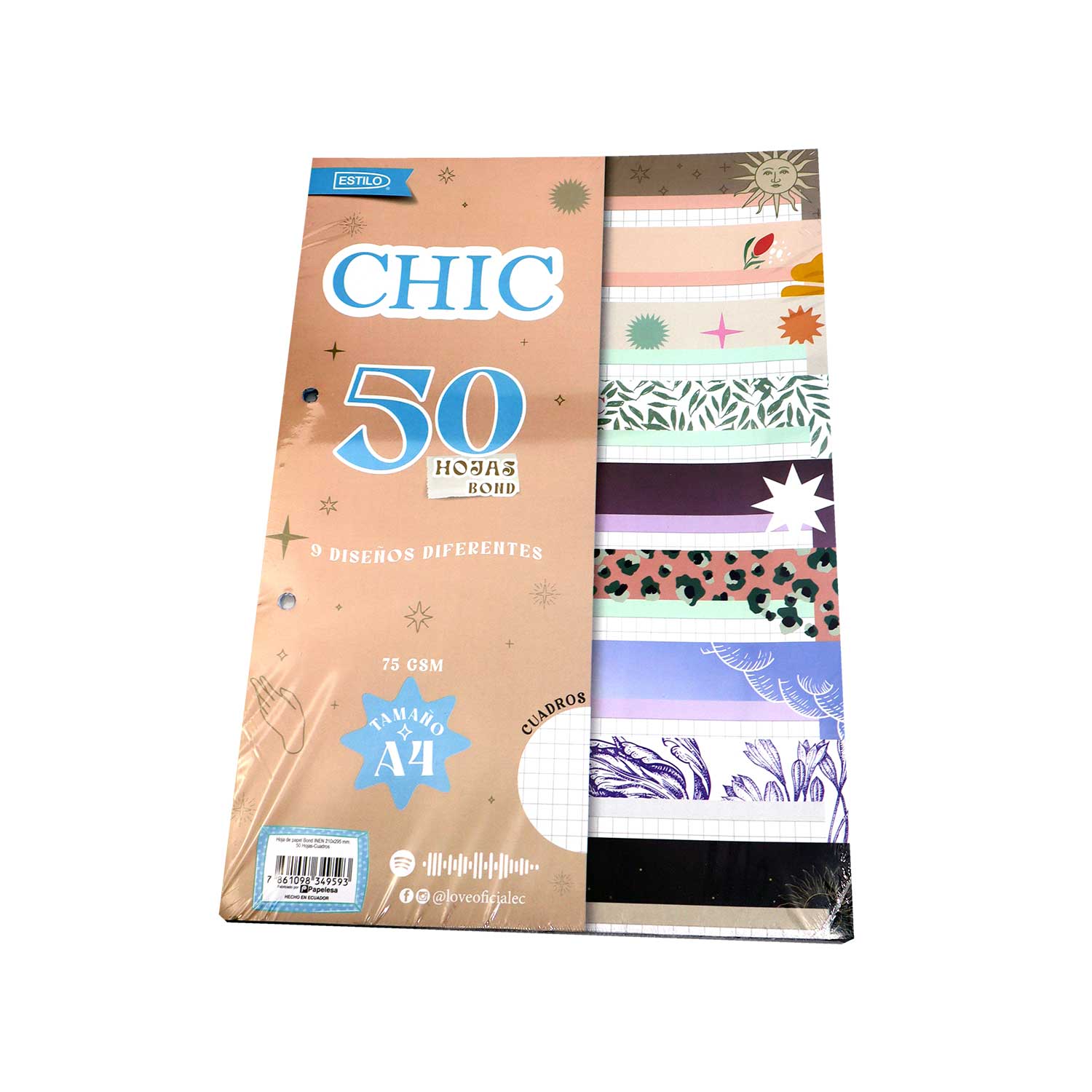 HOJA CHIC 60 GR A4 FUNDA DE 50 UNIDADES DISPONIBLE RAYADO 1 LINEA, 2 LINEAS, 4 LINEAS, CUADROS – CUADROS