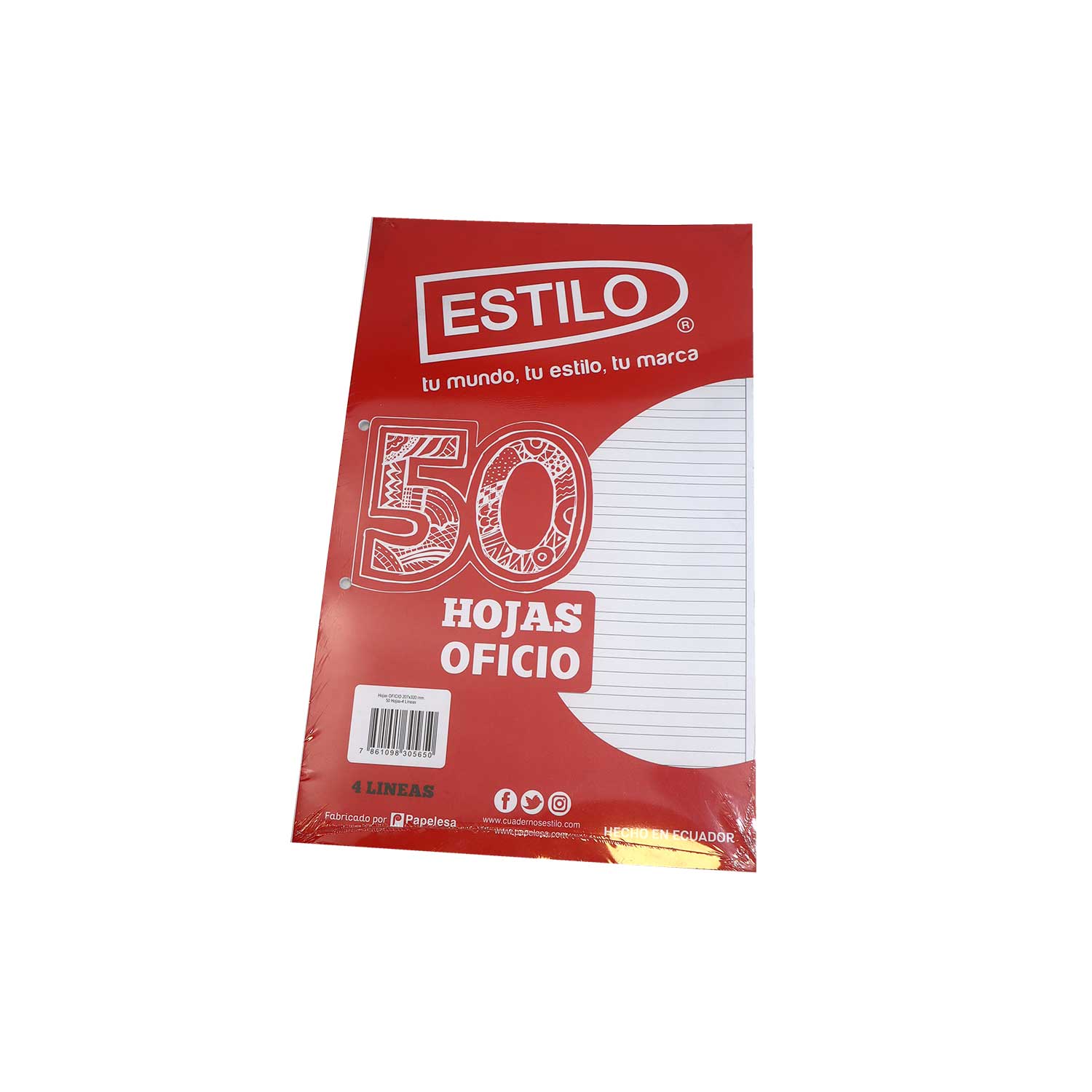 HOJA ESTILO 56GR OFICIO FUNADA DE 50 UNIDADES DISPONIBLE EN RAYADOS 1 LINEA, 2 LINEAS, 4 LINEAS, CUADROS, PARVULARIA 1 LINEA, PARVULARIA CUADROS, DIBUJO CON MARGEN – 4 LINEAS