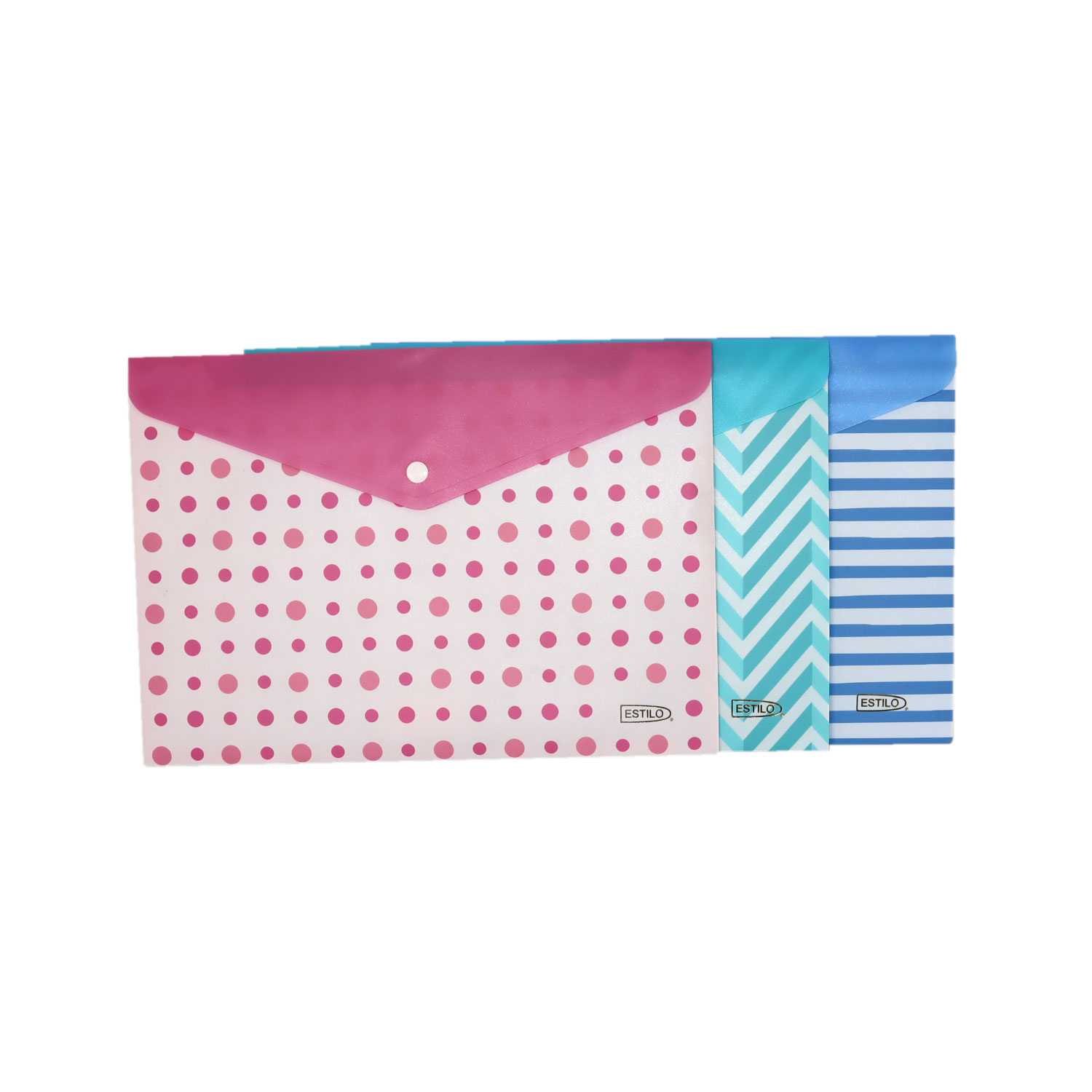 SOBRE PLASTICO ESTILO A4 CON BOTON MODELOS RAYAS, PUNTOS, ZIGZAG REF.FB1405-MK
